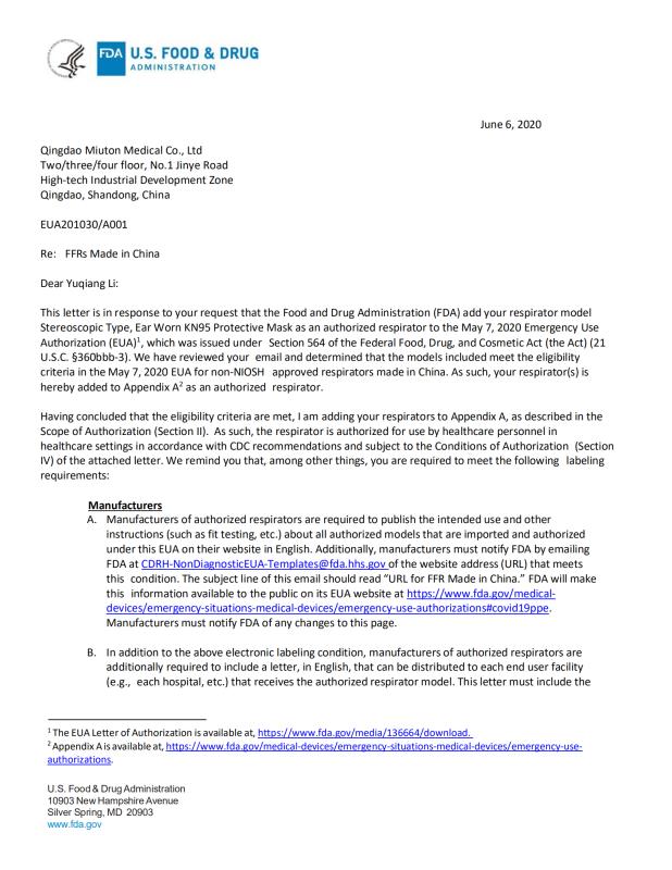 KN95 FDA Registration White List (EUA)